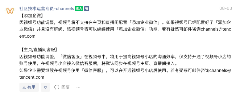 请问两个问题:1、视频号主页怎么在介绍中加入“添加企业微信”这个跳转功能?2、视频号主页怎么把“私信”按钮变成“客服”按钮?