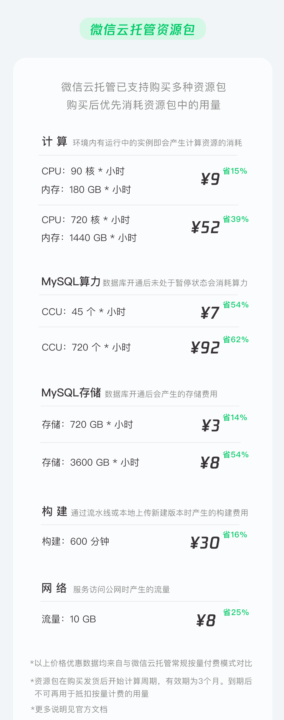 微信云托管已支持购买多种资源包,购买后优先消耗资源包中的用量,根据业务需求灵活搭配购买更加实惠。