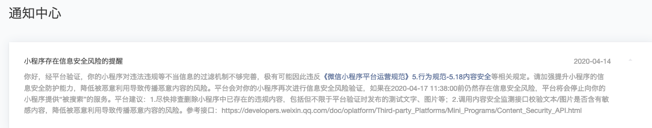 你好,经核实,你的帐号(可上传违规敏感文字图片)确实存在涉嫌未设置过滤违法、违规等不当信息内容的机制,请自觉遵守国家相关法律法规,不从事违法或违反《微信小程序平台运营规范》及相关规则的内容和行为,谢谢(建议接入官方内容安全接口)