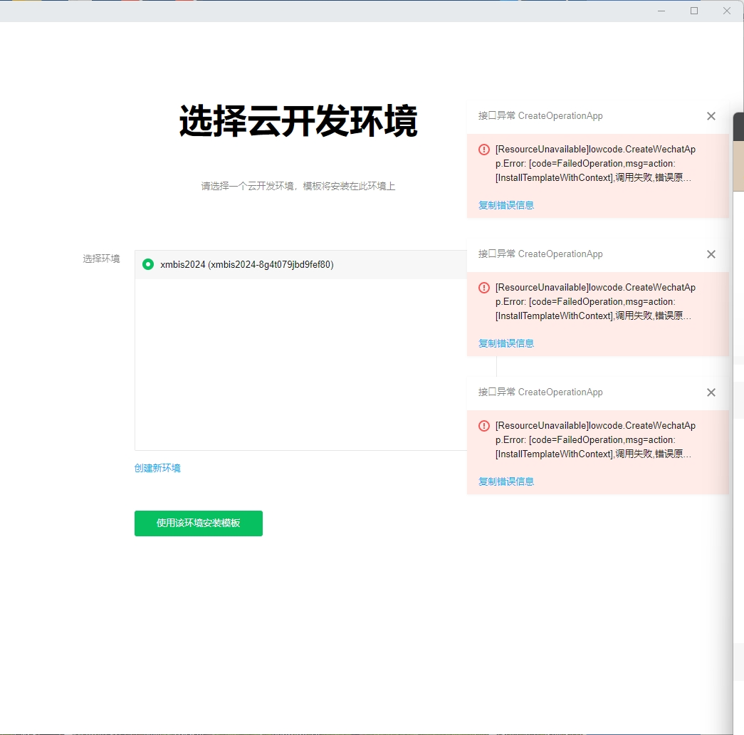 {“title”:“接口异常 CreateOperationApp”,“description”:“[ResourceUnavailable]低代码。CreateWechatApp.Error: [code=FailedOperation,msg=action:[InstallTemplateWithContext],调用失败,错误原因:[100035_依赖的单例模版版本跟已安装版本不匹配,且不支持升级,依赖模板:wxpay, 依赖版本:0.0.17, 已安装版本:0.0.15],reqId=710bc5df-d714-4fdf-b39b-e7c610ed0306][RequestId:75113174-9cc1-4d68-9cbb-c9aaa12eac71]“”,“envId”:“”,“wxAppId”:“”,“uin”:“”,“v”:“2.1.2”,“Code”:“ResourceUnavailable”,“Message”:“低代码。CreateWechatApp.Error: [code=FailedOperation,msg=action:[InstallTemplateWithContext],调用失败,错误原因:[100035_依赖的单例模版版本跟已安装版本不匹配,且不支持升级,依赖模板:wxpay, 依赖版本:0.0.17, 已安装版本:0.0.15],reqId=710bc5df-d714-4fdf-b39b-e7c610ed0306]“,”BFFRequestId“:”9640fdd6-ffd4-407a-9ed3-ef4258700552“,”RequestId“:”75113174-9cc1-4d68-9cbb-c9aaa12eac71“}”}
