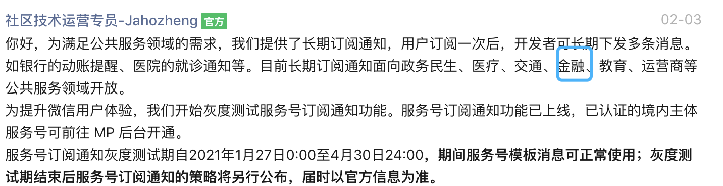 看到客服回答长期订阅通知开放的行业领域有【金融】类
