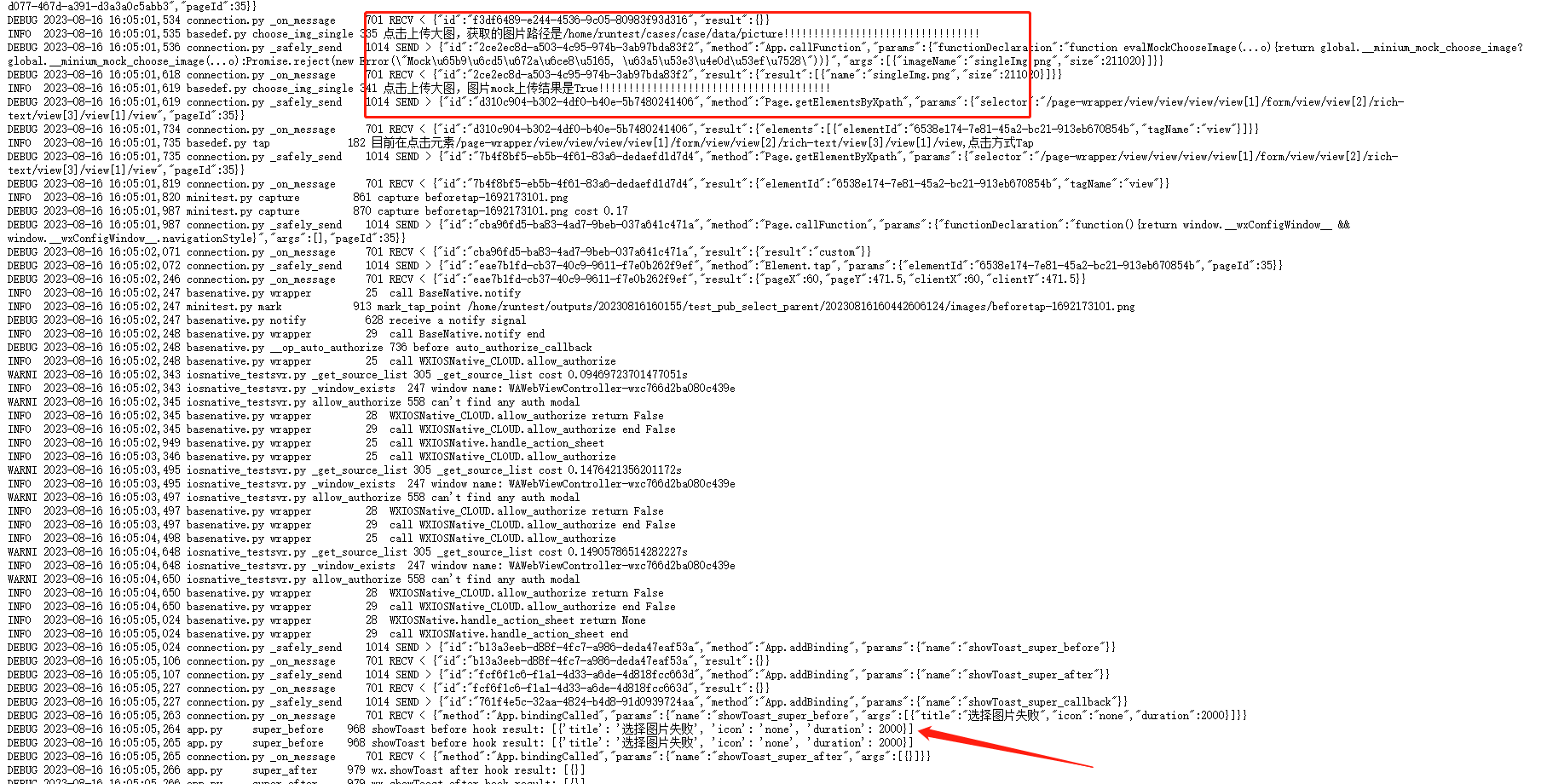 云测小程序操作日志,打印图片路径和mock_choose_image的请求结果都是没问题的,