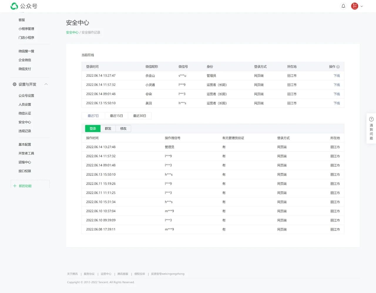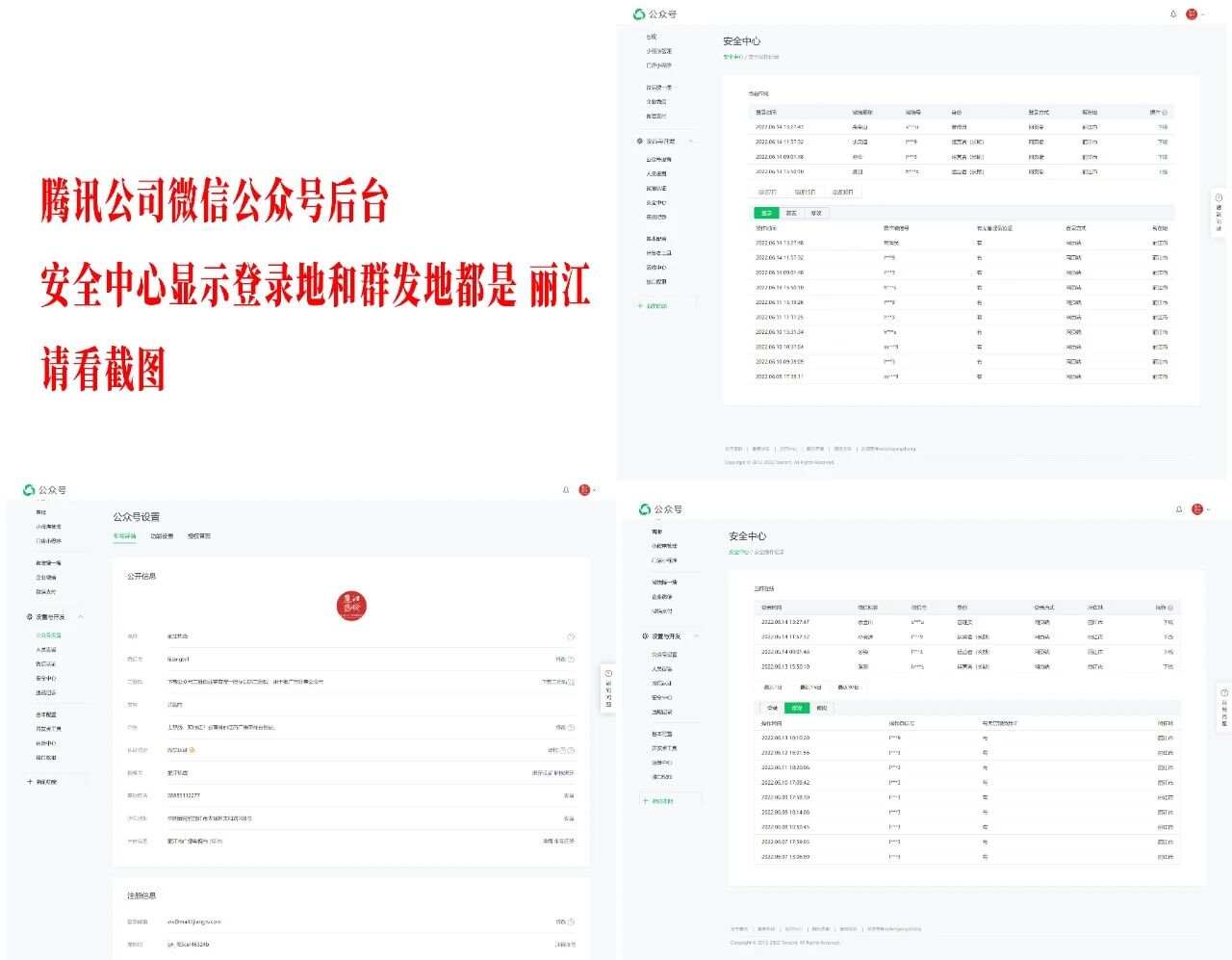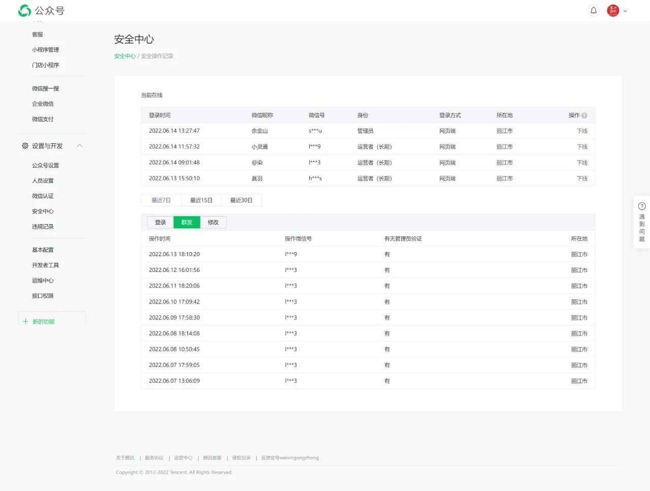 我这个公众号后台“安全中心”“群发所在地”“登录地”均显示为“丽江”,见图1