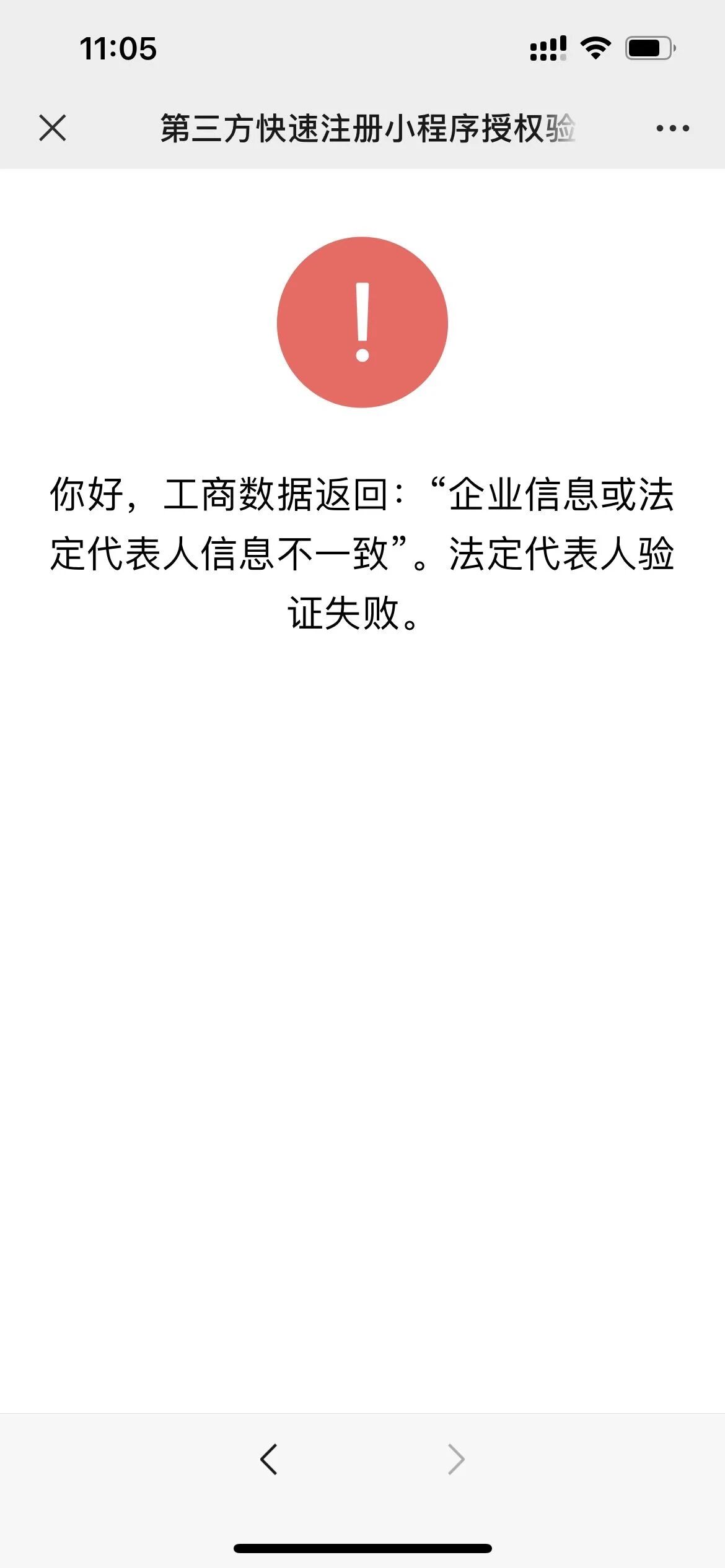 以下微信认证提示:工商数据返回:“企业信息或法定代表人信息不一致”。执照未更过,提示如图所示。请问如何解决?