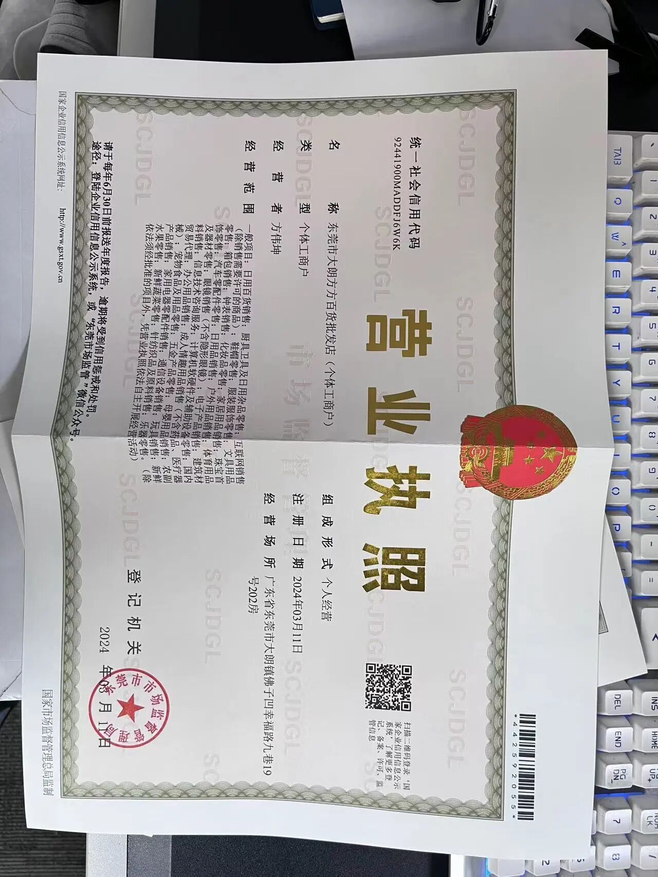 执照名称:东莞市大朗方方百货批发店(个体工商户)