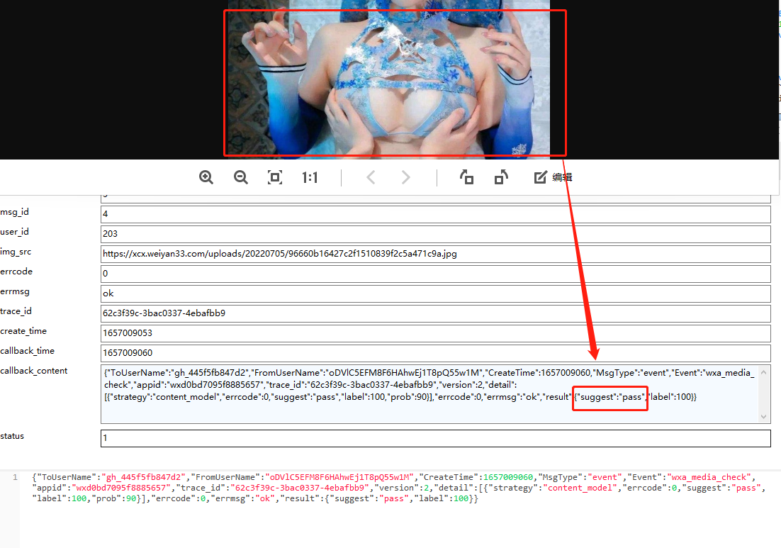 这张图明显的黄图,正常的返回结果应当是不安全的吧,为何返回结果为:"suggest":"pass"