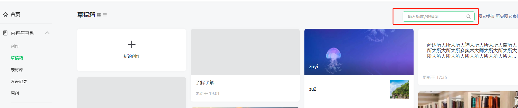 今天草稿箱改版,体验很差!进入素材库,不能直接搜索旧图文,还要再点一次右上角的【历史图文素材】出来新的页面再搜索,搜索出结果后,还要按一个按钮把它搬回【草稿箱】才能再打开编辑,简直浪费我点击和时间!