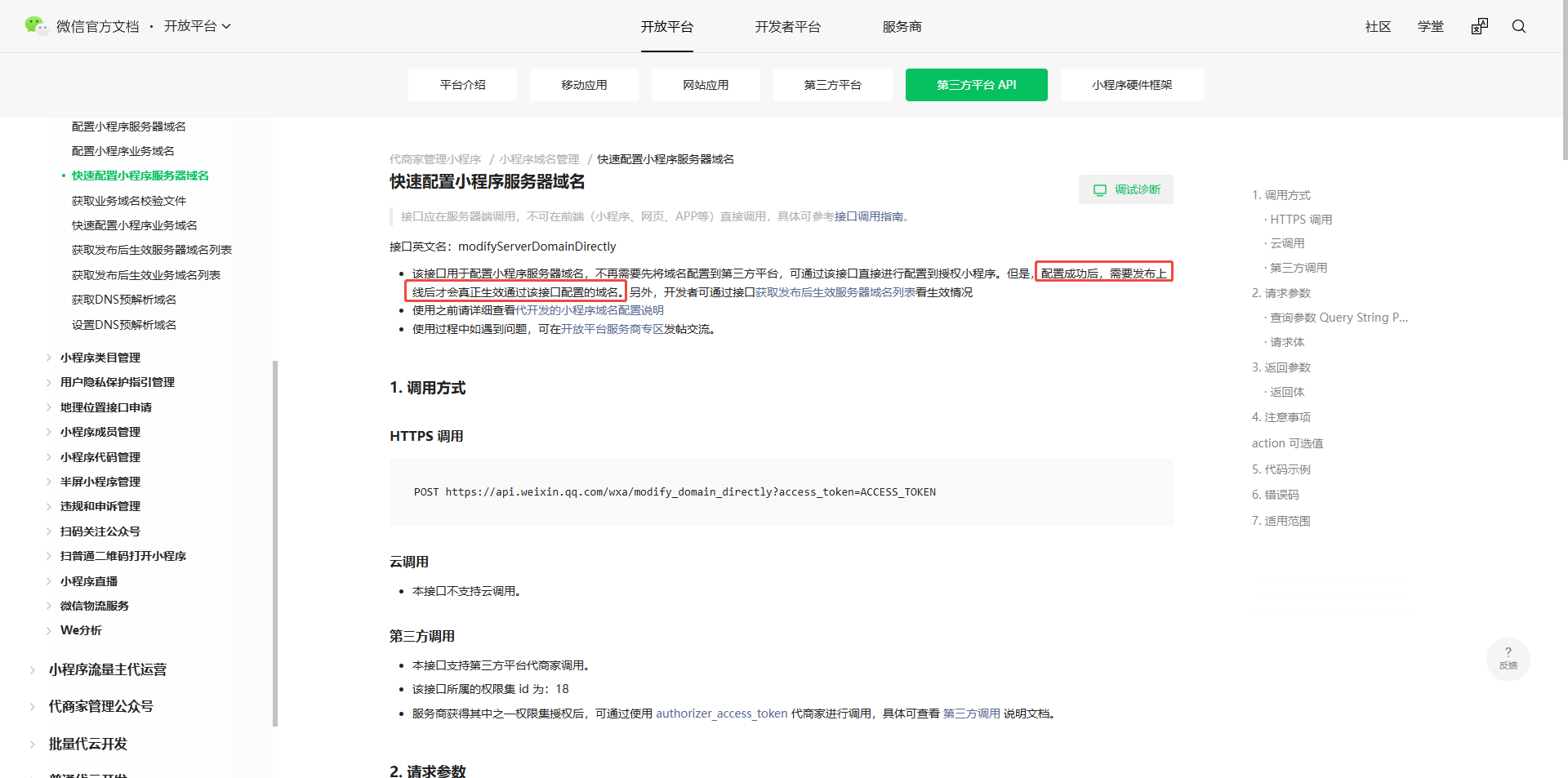 你好,以接口文档说明为准,https://developers.weixin.qq.com/doc/oplatform/openApi/miniprogram-management/domain-management/api_modifyserverdomaindirectly.html