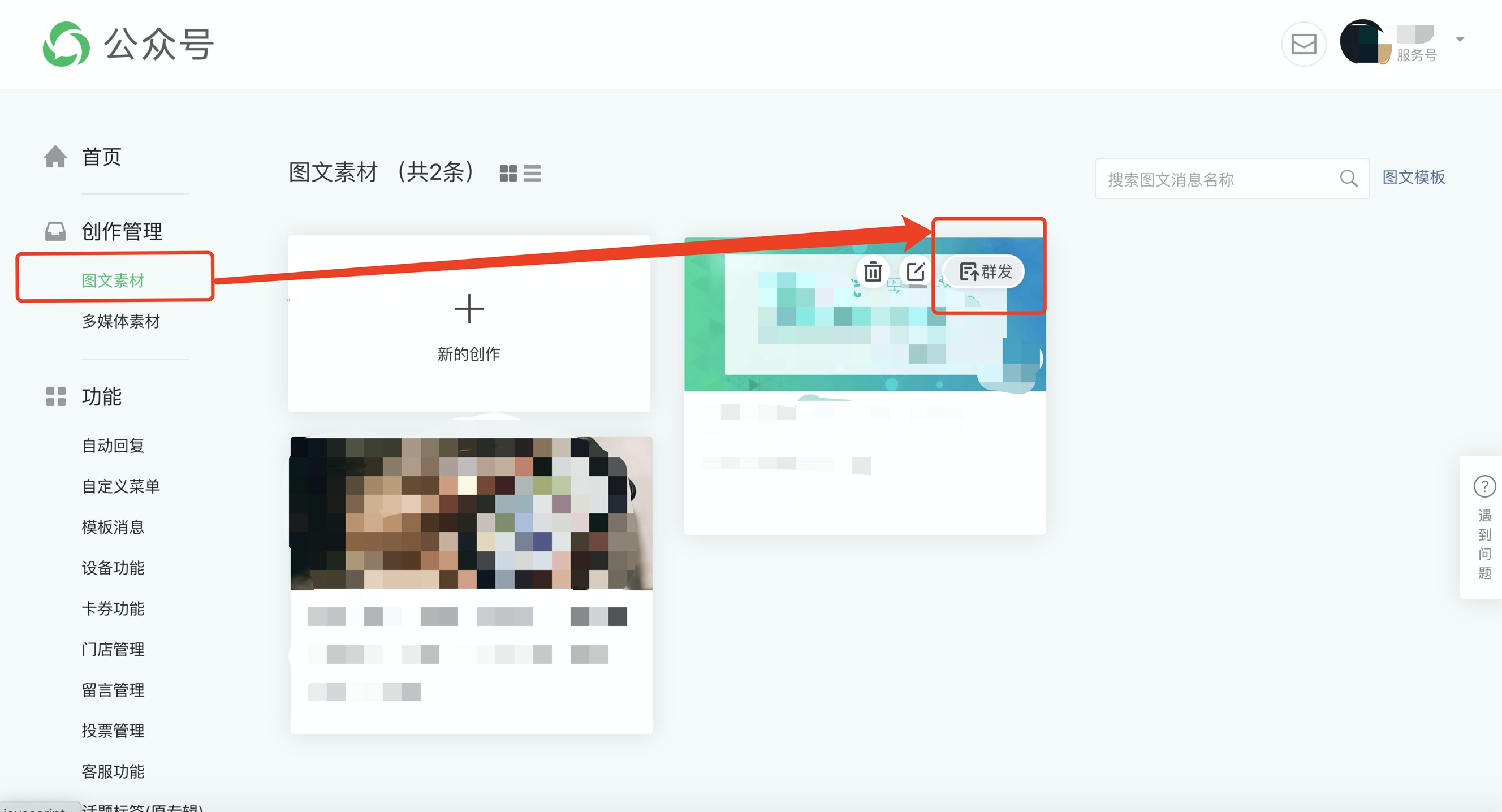 能详细描述下问题,或者截图展示下吗?已创建图文素材的右上角就可以群发,你是没有这个“群发按钮”,还是其他问题