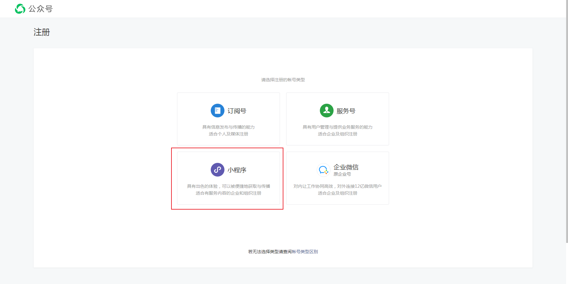 进入微信公众平台 https://mp.weixin.qq.com/,注册一个的小程序账号,注意要选择国内非个人主体。如果有账号就不需要再次注册。
