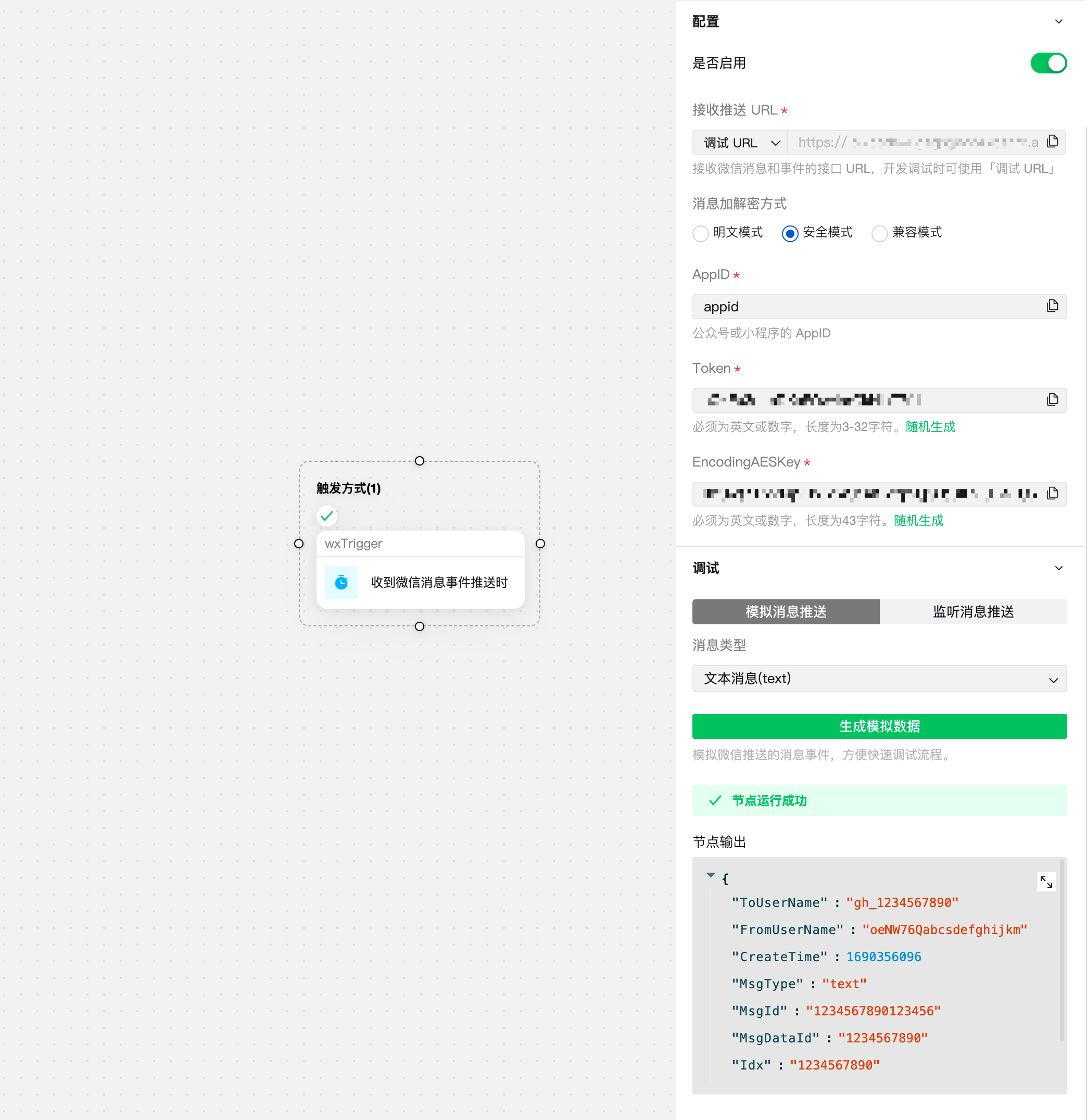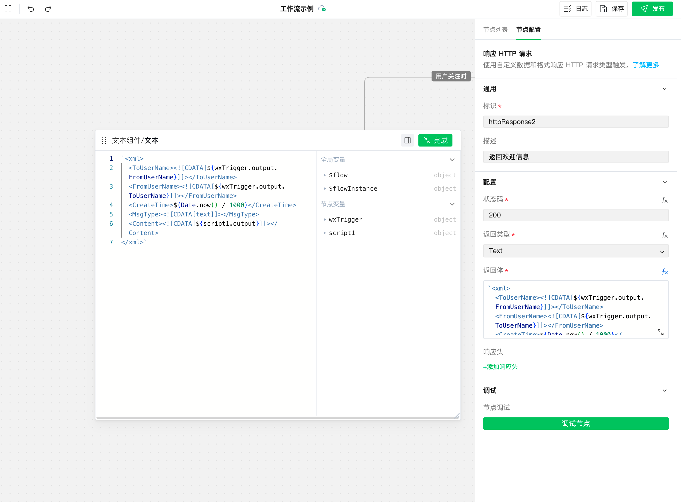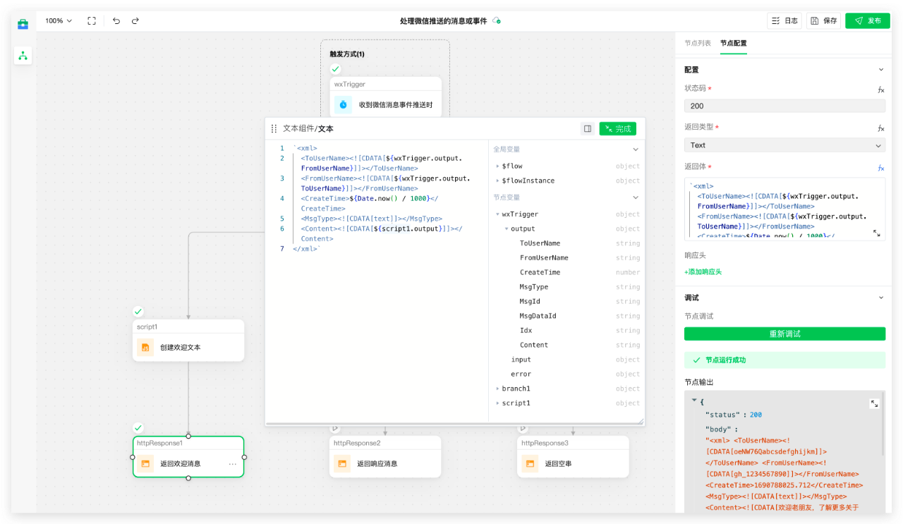能力三:支持快速回复微信公众号或小程序客服消息。通过「响应 HTTP 请求」节点,返回自定义的响应信息,实现回复消息功能