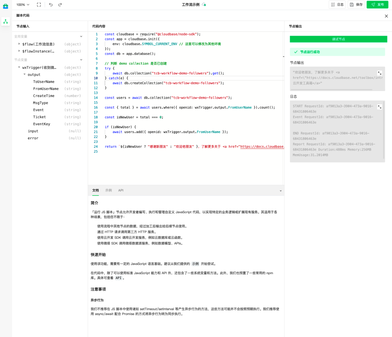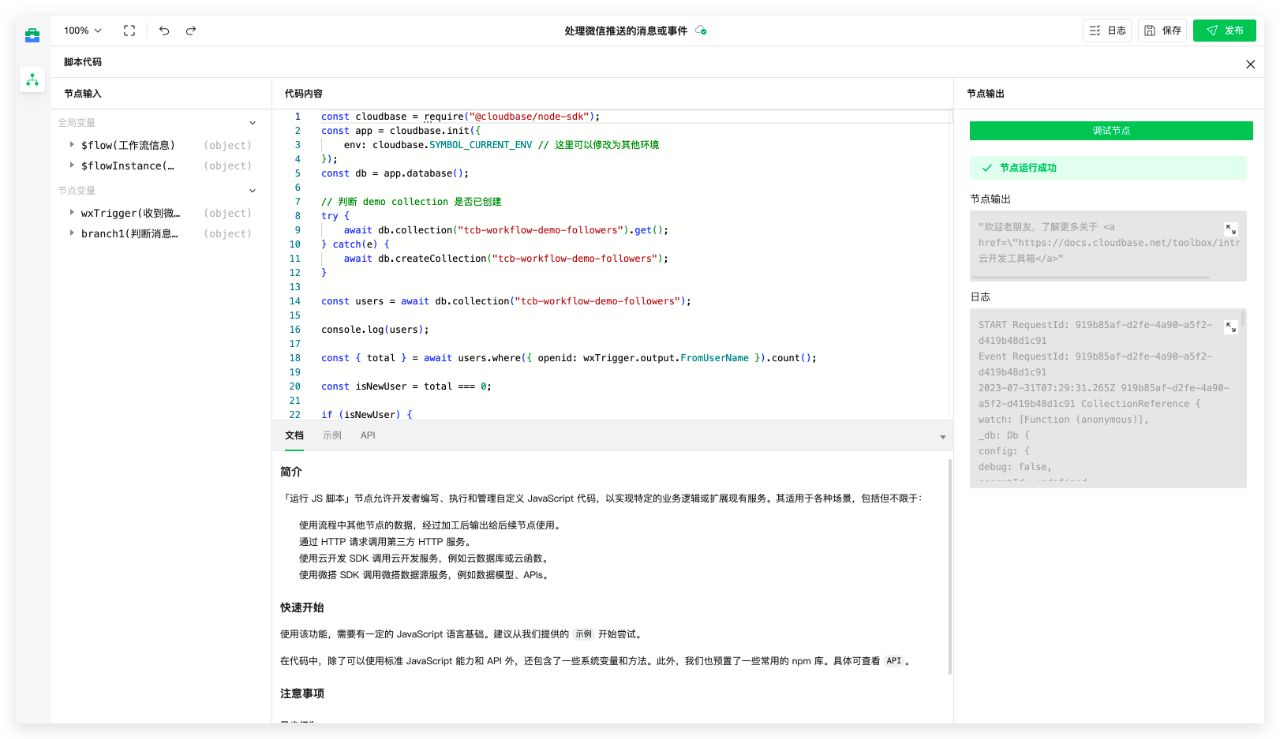 能力二:支持 JS 脚本节点,快速编写、调试自定义代码