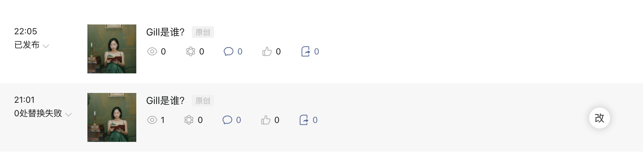 然后我就去把原来被替换的文章删除了,结果新发表的文章就显示“0处替换失败”。这篇新文章虽然显示已经发表成功,但是无法添加到页面模版里,也无法删除,右侧只有一个选项“改”。