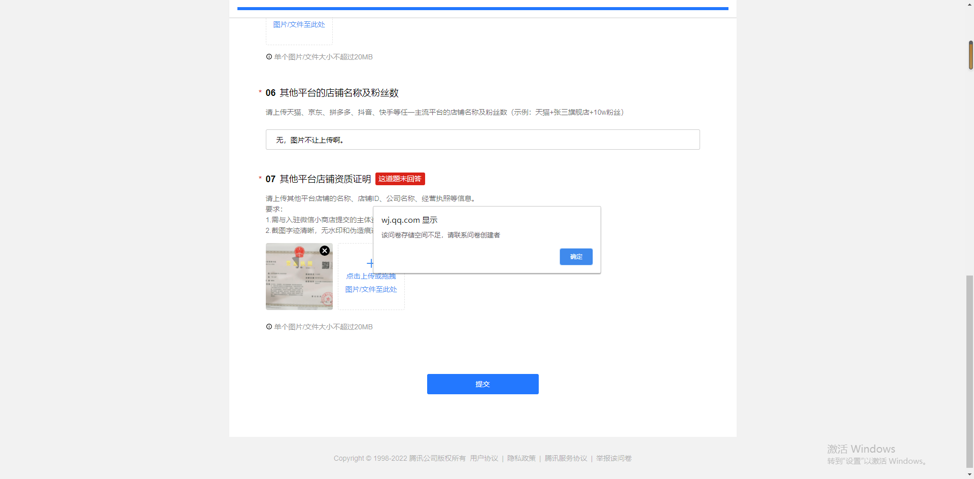 问卷提交不了营业执照等图片,显示空间不足!!!!!!你们能不能解决了!!!我们公众号18万粉丝,抖音100万+的粉丝,参与个报名都参与不了!!!