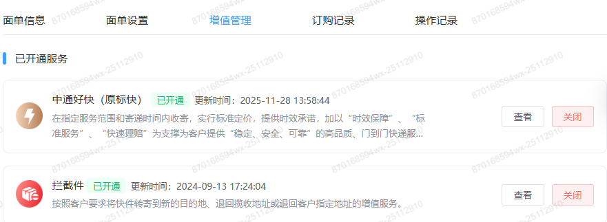 微信小店电子面单的中通快递是否有增值服务(中通好快),是否需要在取号接口中单独传入。如有,麻烦提供一下文档。