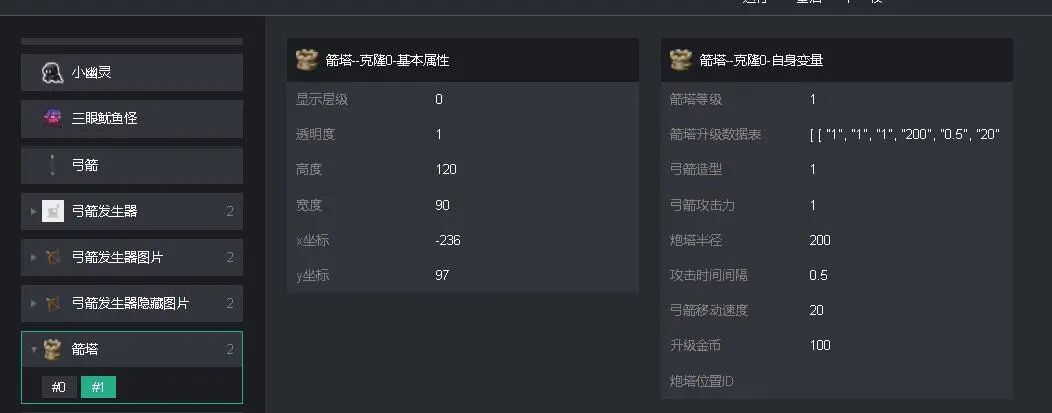 如上图,炮塔位置按钮 的 炮塔ID为私有变量,创建炮塔位置索引为全局变量,箭塔中的 炮塔ID 为私有变量,想把 炮塔位置按钮的 私有变量“炮塔ID”的 数值传递 给 箭塔 的私有变量 “炮塔ID”。后2个图为运行数据,箭塔的私有变量 炮塔ID 没有任何数值