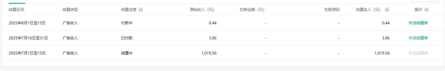 你好,核实流量主未及时补充财务资料,是在8月初才补充的,正常结算流程是从7月下半月收入开始结算,历史未结算的收入将在补充财务资料后自动发起补结。但由于补结流程及时间较长(1-3个月),历史结算区间的结算进度将在一段时间内保持在“结算中”状态。流量主无需焦虑,补结成功后,结算单会下发至对应的结算邮箱的,还请耐心等待。