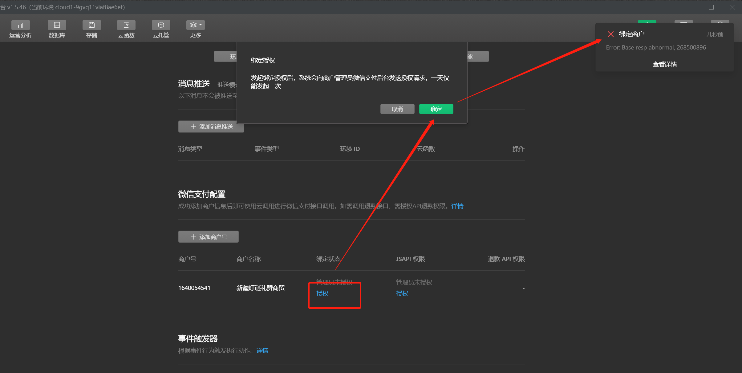 在微信商户号管理上已经绑定小程序ID,但在云开发后台却无法完成授权。