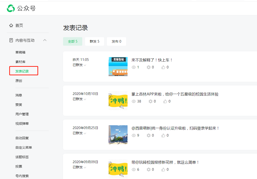 发表记录的接口什么时候能提供一下呀,现在群发的记录没办法获取到