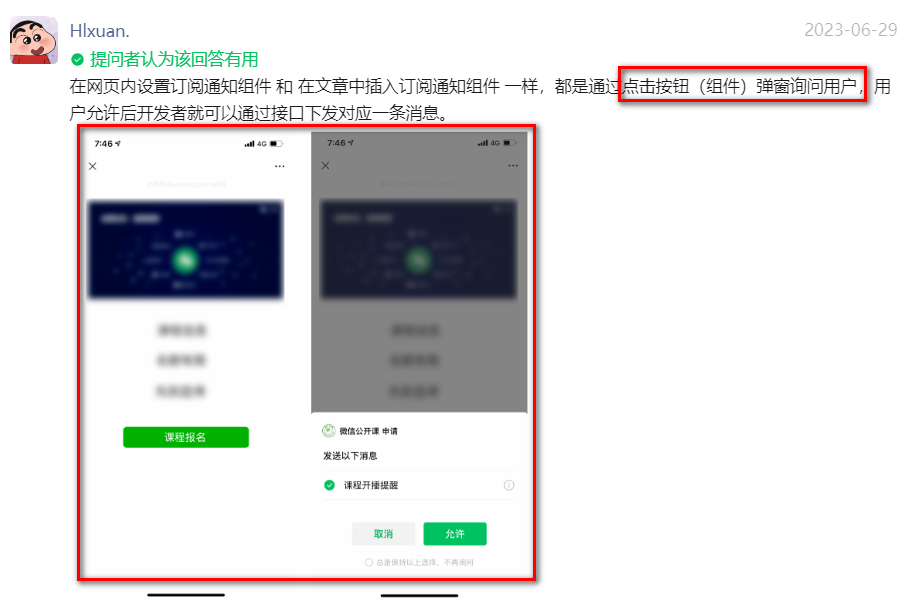 在网页内设置订阅通知组件 和 在文章中插入订阅通知组件 一样,都是通过点击按钮(组件)弹窗询问用户,用户允许后开发者就可以通过接口下发对应一条消息。