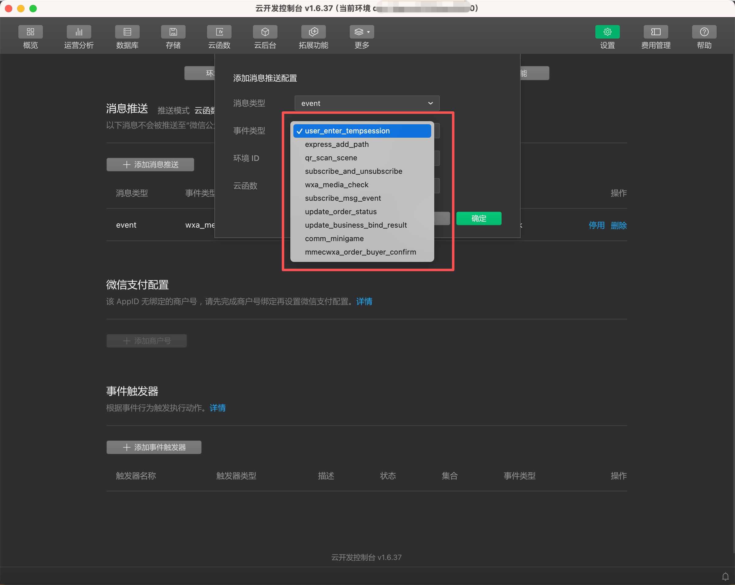 下面是现在云开发里的可选的event事件,可以看到并没有这个选项。