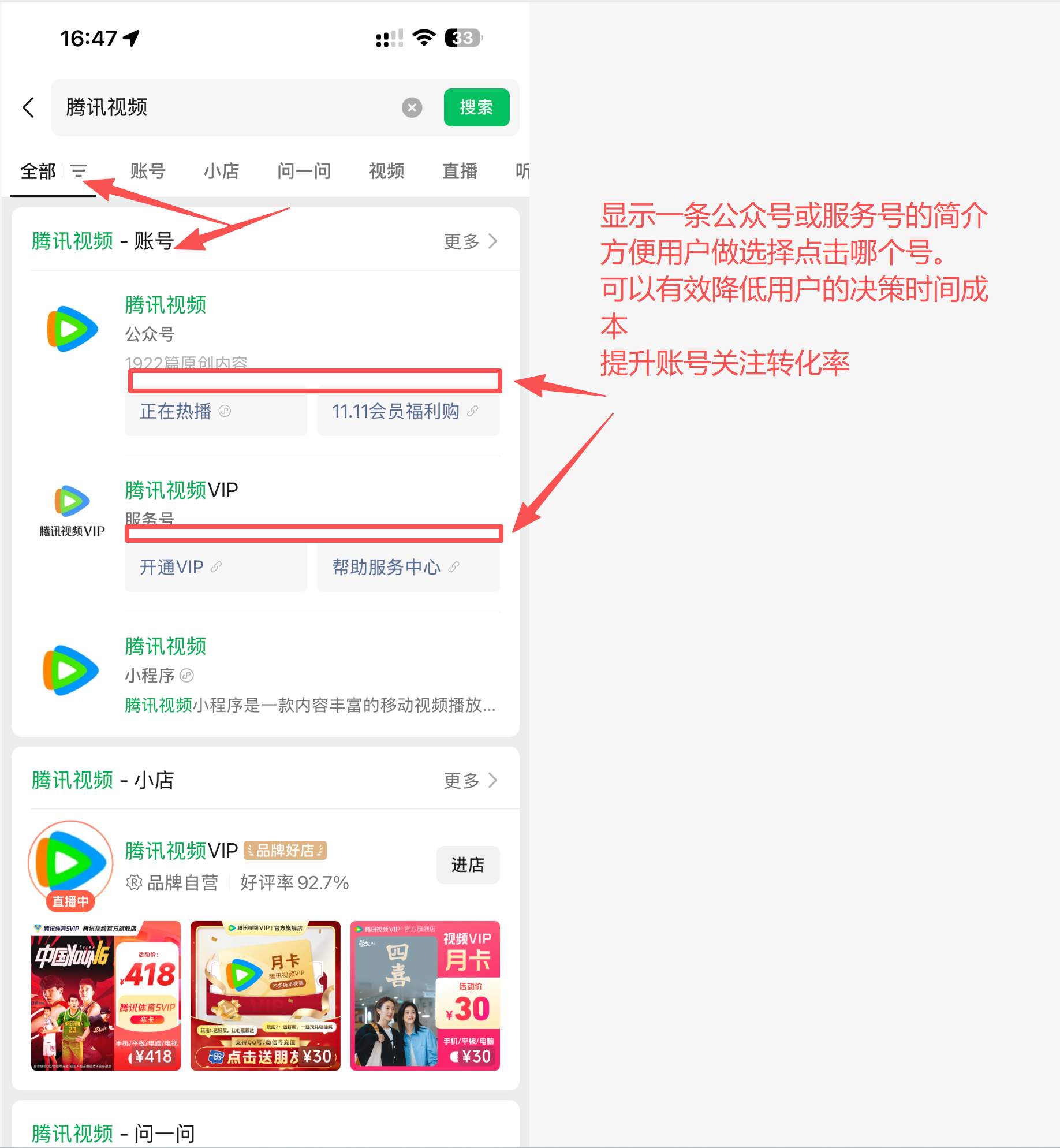 作为高频使用公众号、服务号的用户,我发现当前“搜一搜”首页搜索结果页仅呈现账号名称,用户在同类账号中决策时,常因缺乏核心定位、特色服务等关键信息,陷入“点进主页看简介再返回筛选”的低效循环,既耗时又易错过匹配需求的服务。