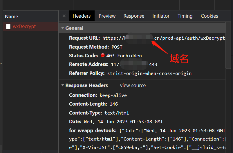 1、描述:微信开发工具上小程序请求接口报403,没有返回Invalid CORS request相关跨域的提示