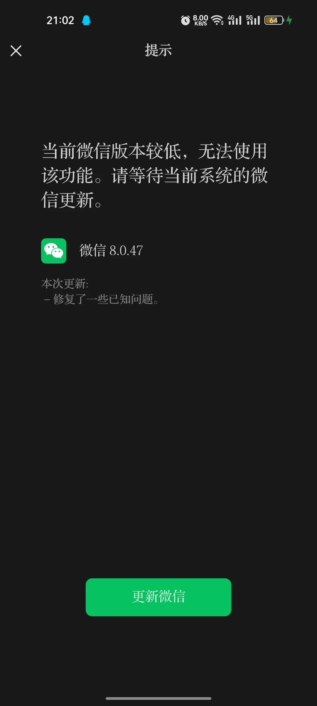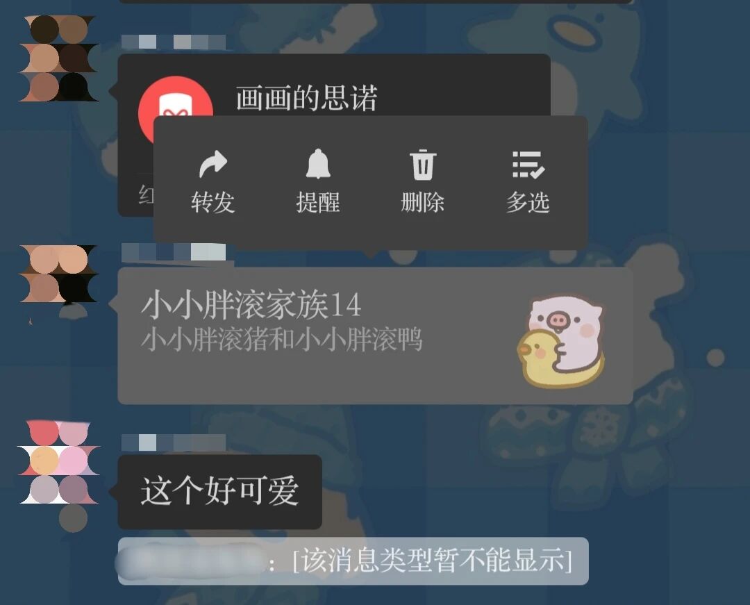 分享的表情包主页没有引用按键,别人引用的表情包提示该消息类型暂时无法显示(p1)。点击灰字进去让更新(p2),更新完以后还是重复上述情况没有改变。