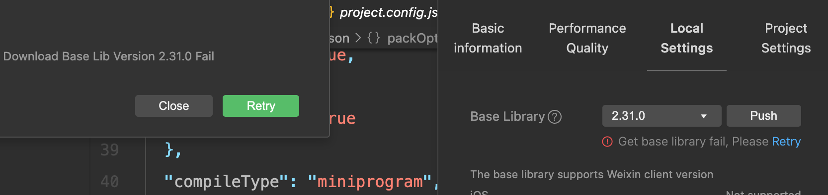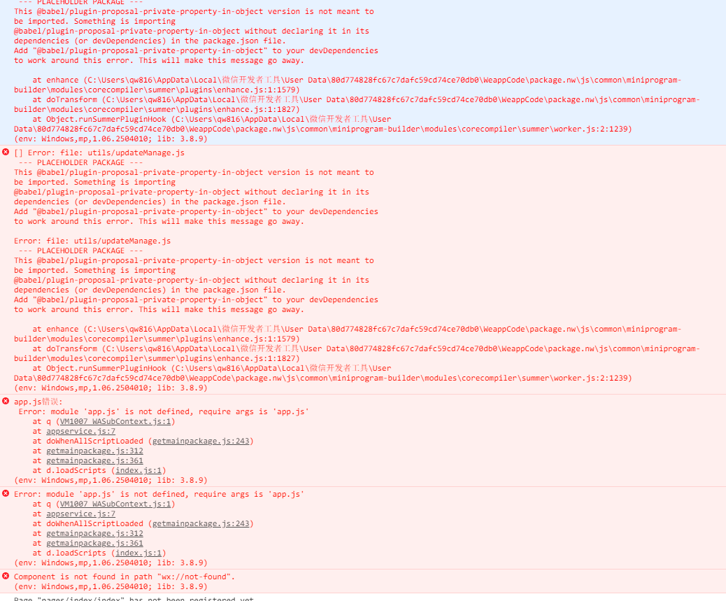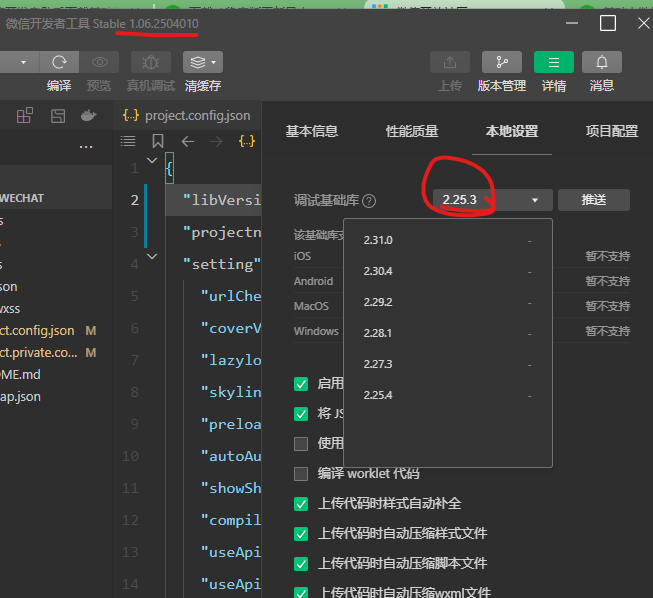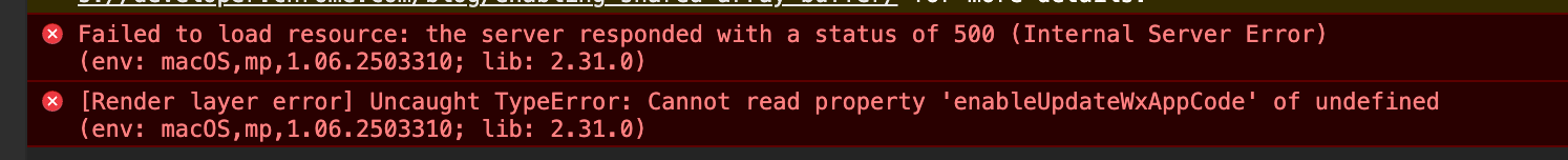 Failed to load resource: the server responded with a status of 500 (Internal Server Error)(env: macOS,mp,1.06.2503310; lib: 2.31.0) [Render layer error] Uncaught TypeError: Cannot read property 'enableUpdateWxAppCode' of undefined(env: macOS,mp,1.06.2503310; lib: 2.31.0)代码依赖分析功能无法使用