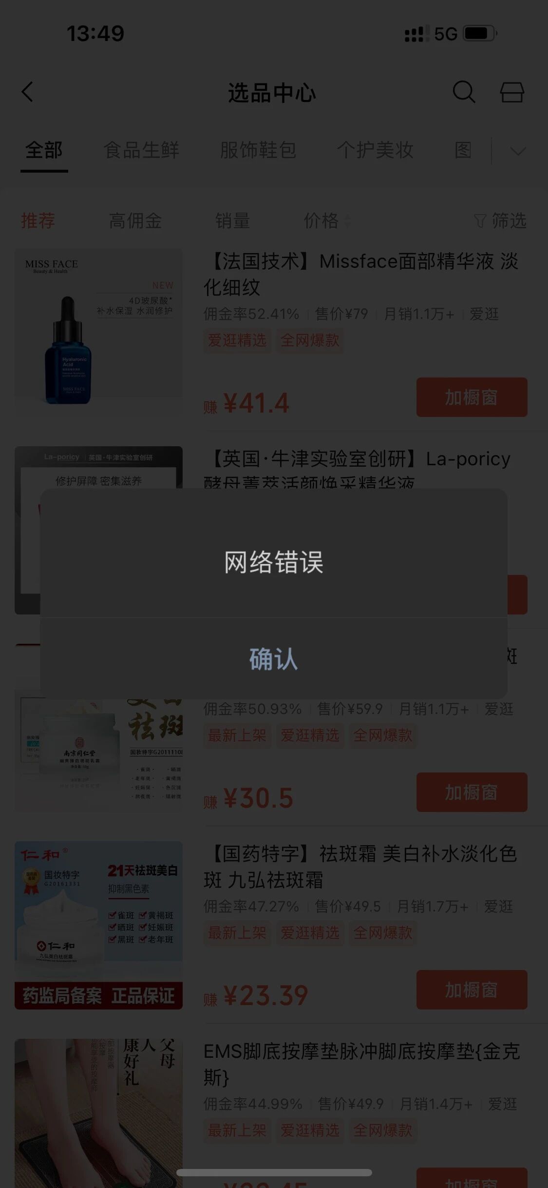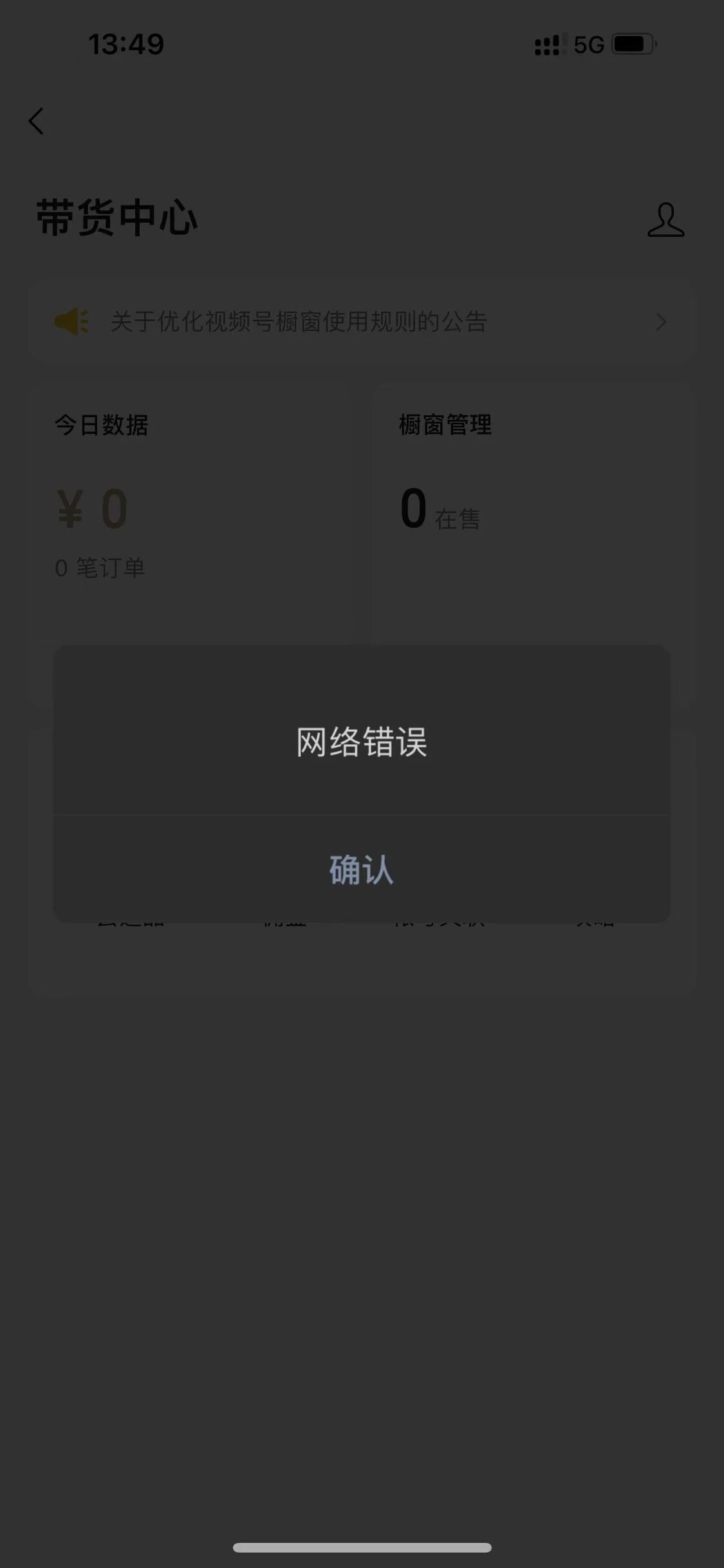 在搜索栏中搜索视频号带货,点击立即带货后,弹窗“网络错误”,然后也无法加入橱窗,第一次使用这个小程序,并且没有挂载VPN。