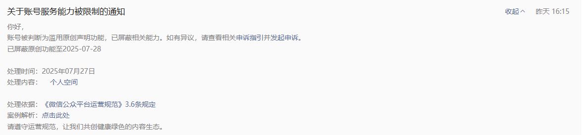 你好,查看当前封禁时间为1天,即收到处罚通知时起24小时到期自动恢复,请今天16:15重新尝试。