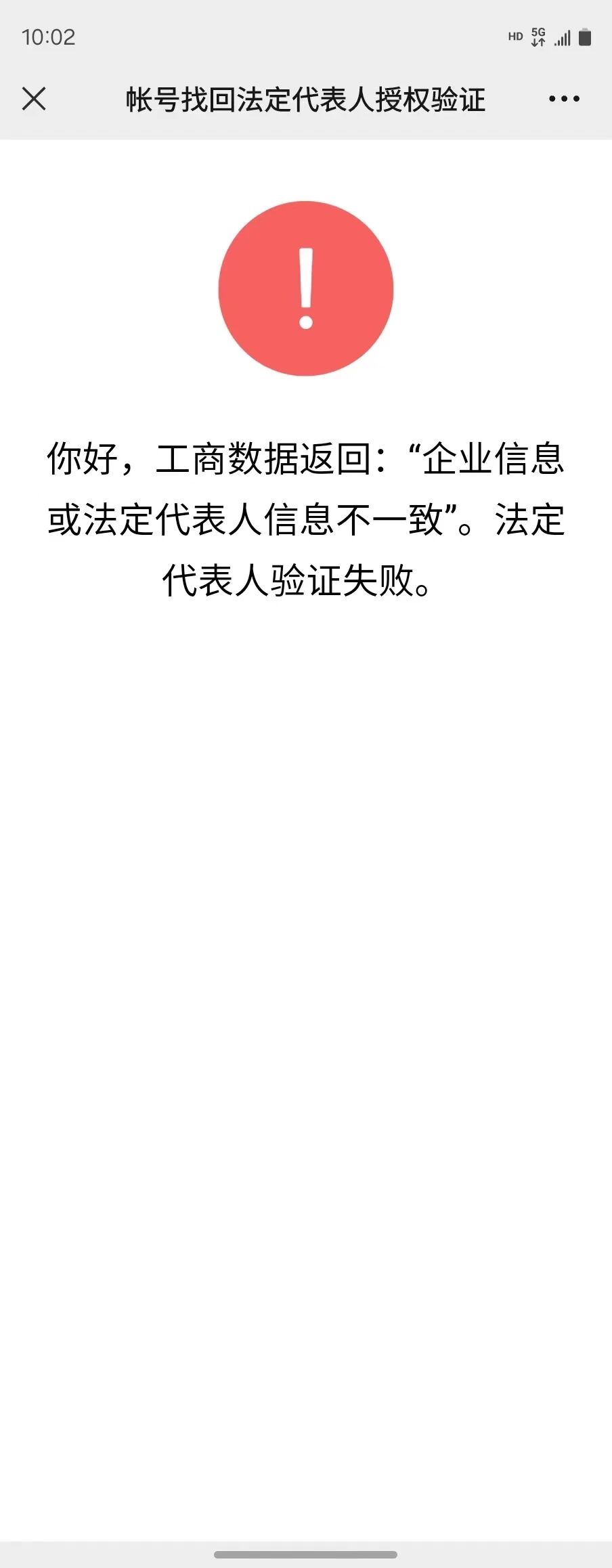 绑定了企业主体的微信公众号冻结了,想要找回后再办理注销,但找回时法人微信扫码显示:你好,工商数据返回:“企业信息或法定代表人信息不一致”。法定代表人验证失败。排查过了,企业名称和营业执照注册号都没有问题,法人也没有问题,麻烦帮忙解决下呢!