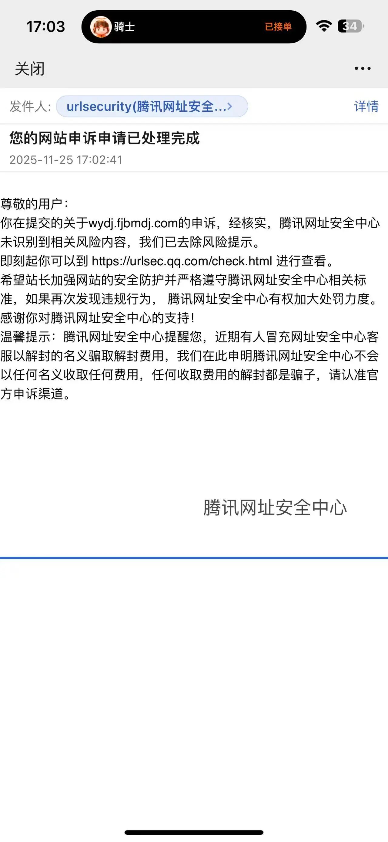 管理后台和h5端口已经全部核验过,没有发现问题内容,烦请解除限制,在腾讯安全中心网址申诉过后,提示没有问题恢复访问,但是现在还是进不去