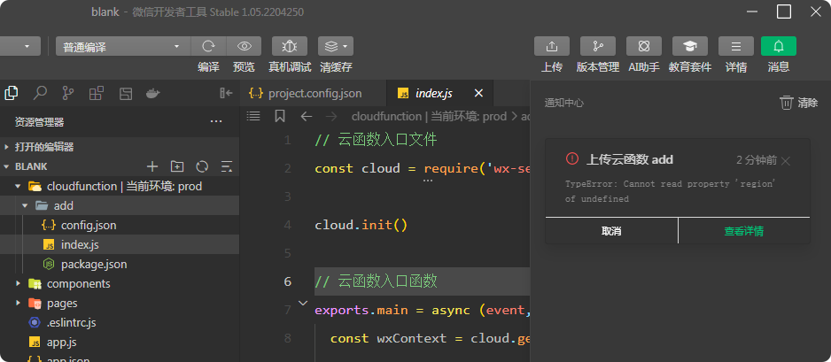 win7 1.05版本的,上传云函数出错,如图,怎么解决?