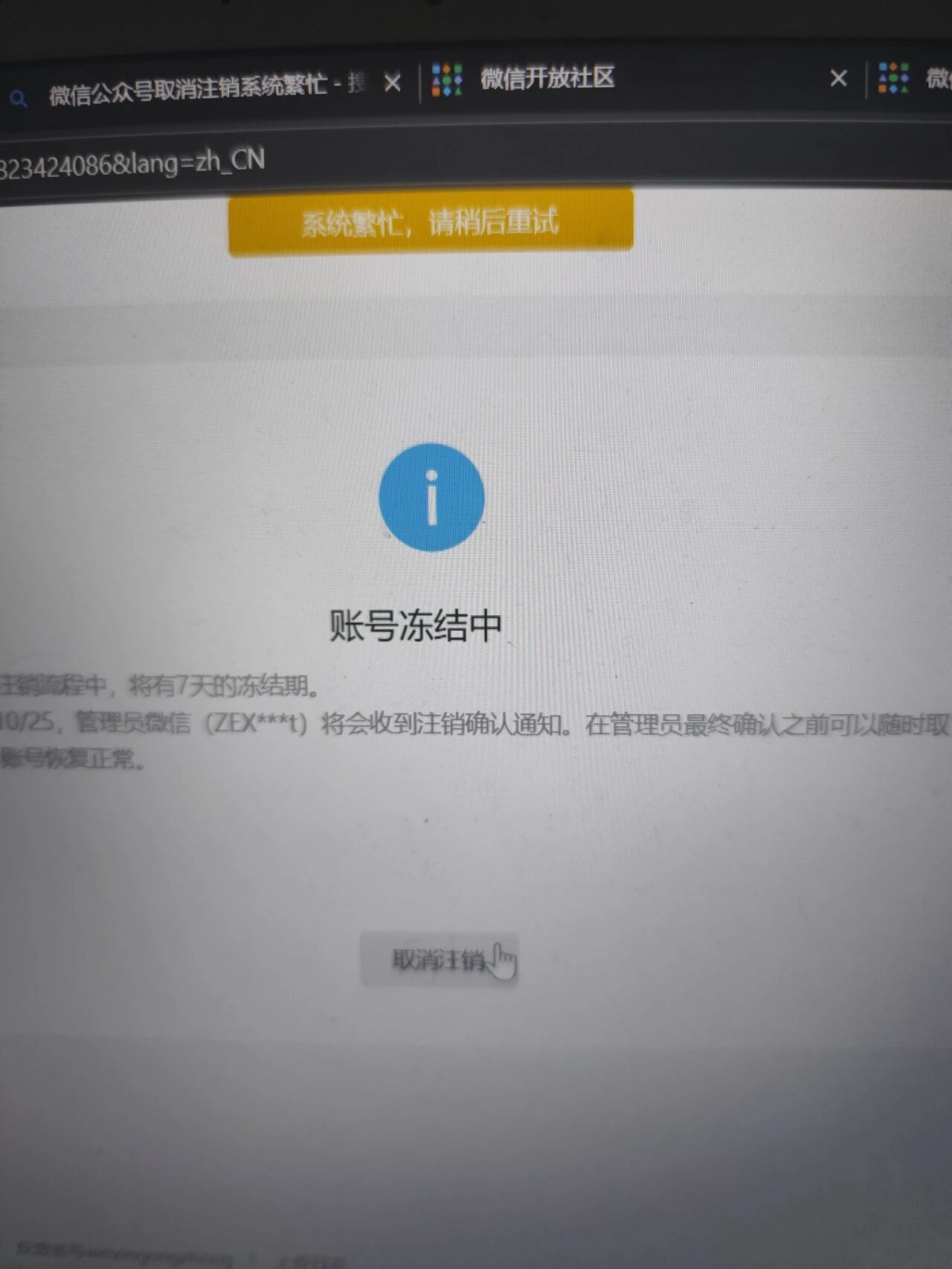 为什么在注销公众号时点击“取消注销”会显示系统繁忙?