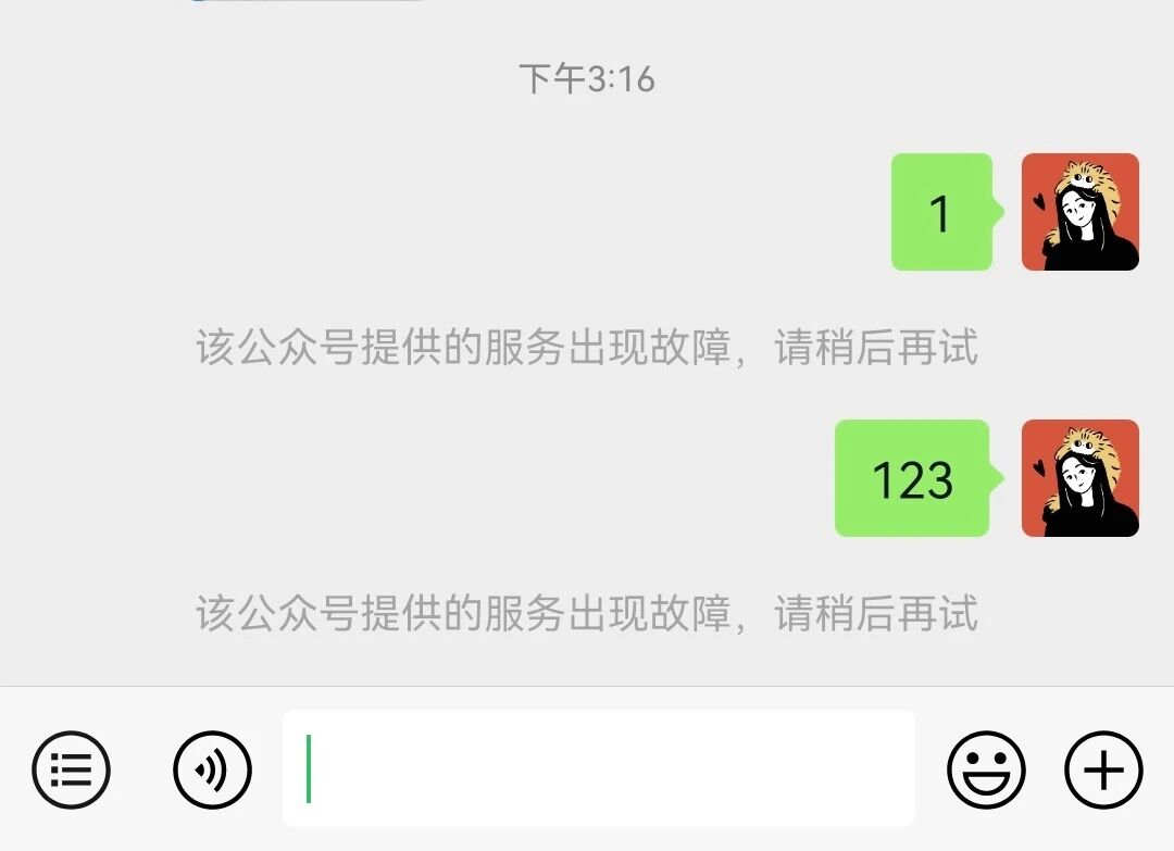 公众号底部对话栏,一发消息就显示服务出现故障是为什么,求解答!谢谢