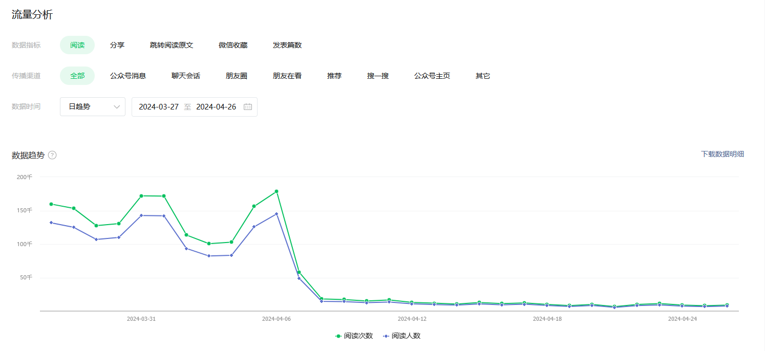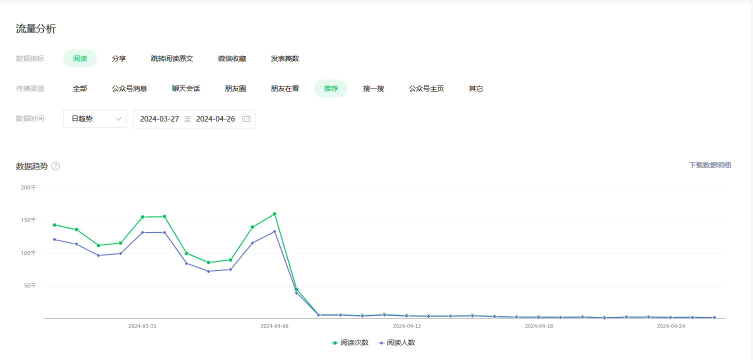 我也是相同情况,从4月23日晚上六七点开始,白天阅读量和关注者增长还一切正常,晚上增长明显没了。后边观察了下每天的推荐都很少,单日阅读量从七八千降到一千左右,目前都看关注者在看。推荐占比也从70%-80%降低到1%-2%。你那边咋样,有恢复正常么?