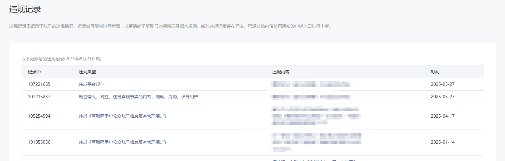 近期违规记录