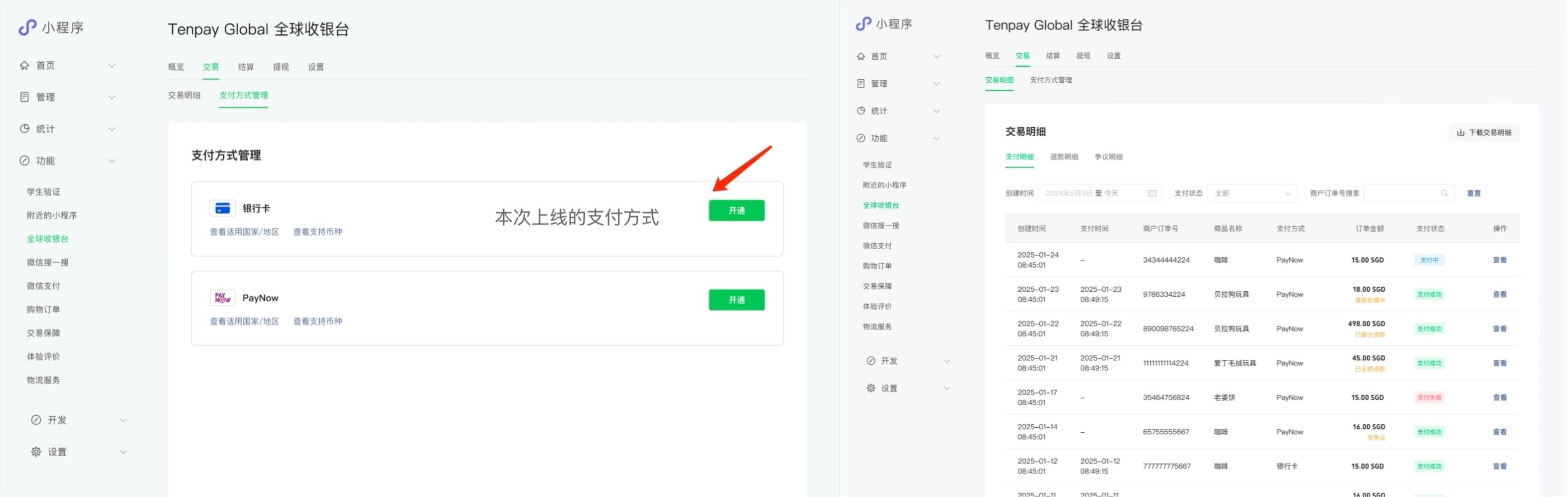 注:若商户小程序注册主体非新加坡,但拥有可用于服务开通的新加坡主体子公司,可联系 Tenpay Global 全球收银台团队(tenpayglobal_cko@tencent.com) 或小程序团队 (miniprogram_global@tencent.com) 申请全球收银台入口权限开通
