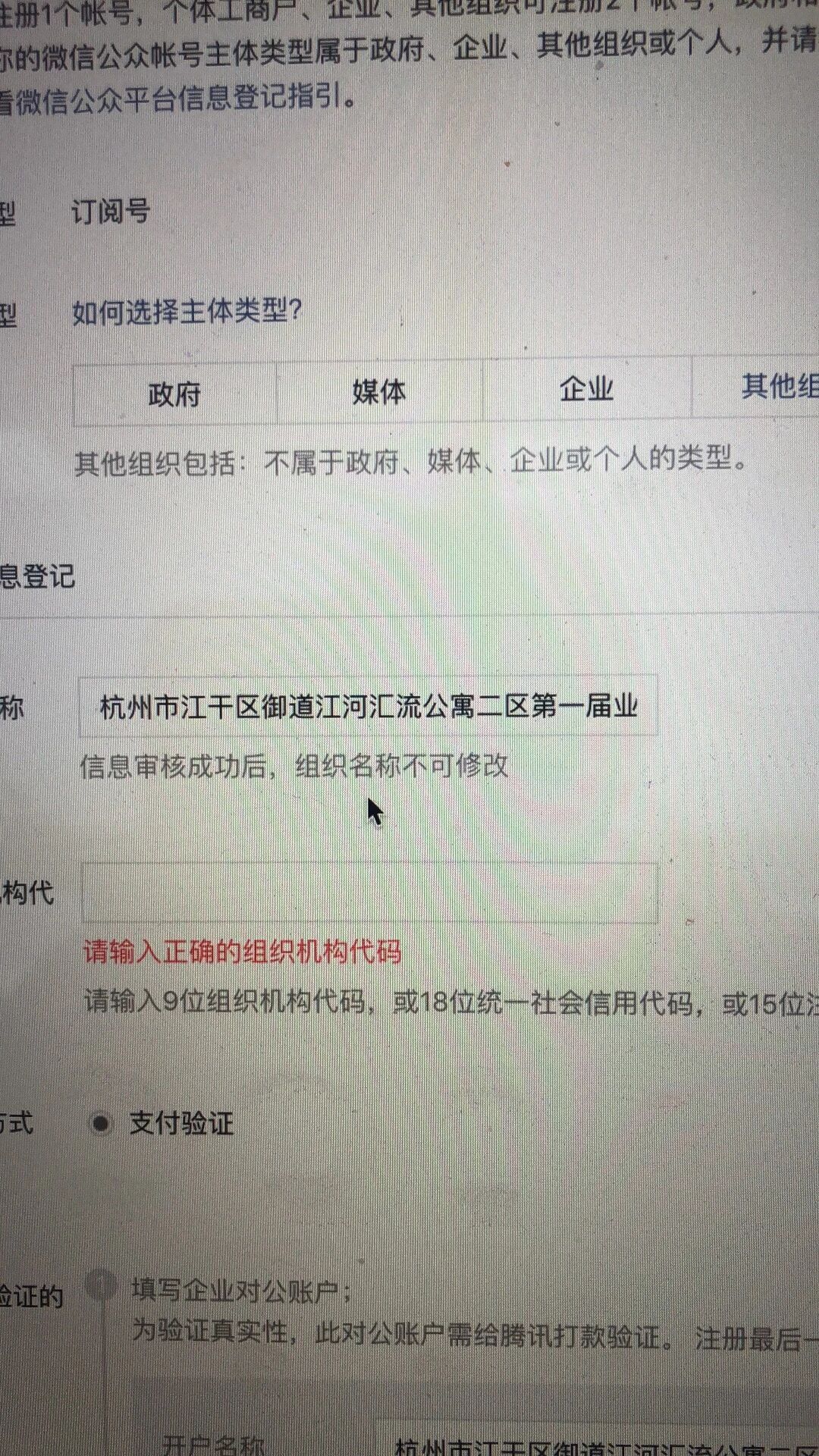 我想以其他组织这项来申请业主委员会的订阅号,但我们没有组织机构代码,我们业委会有备案,有银行开户,我看了有的业委会公众号是可以没有组织机构代码的,但我们在注册过程中页面上必须要求填组织机构代码,不然不让通过。