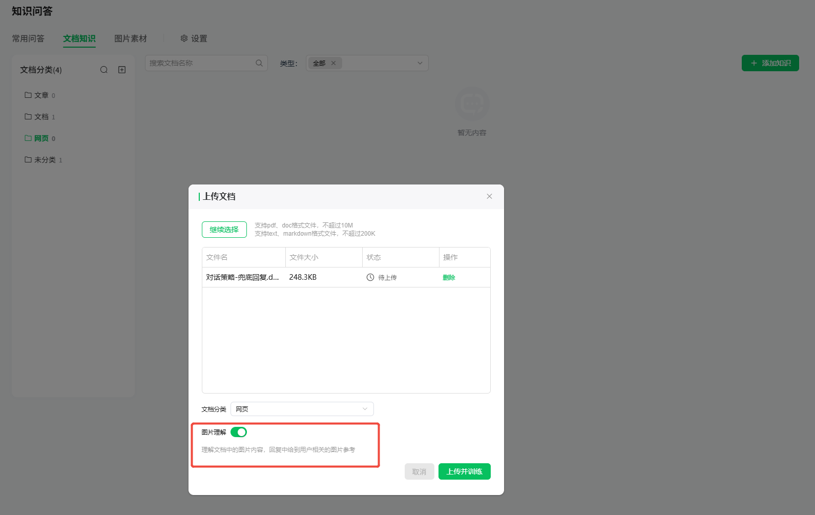 您好 在上传时打开【图片理解】功能,可以理解文档中的图片内容,在回复内容中给到用户相关的图片参考。