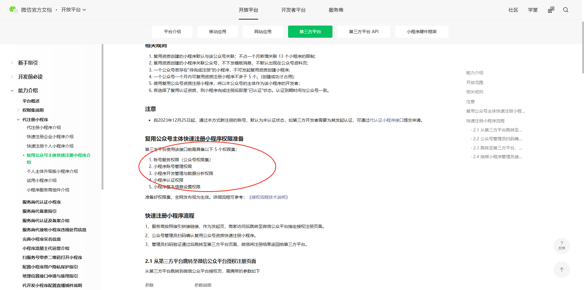 你好,复用公众号主体快速注册小程序第三方平台需要具备(勾选)5个权限集并全网发布生效https://developers.weixin.qq.com/doc/oplatform/Third-party_Platforms/2.0/product/Register_Mini_Programs/fast_registration_of_mini_program.html 检查下第三方平台配置的权限集。若仍未解决,请提供调用接口报错rid、报错截图等信息
