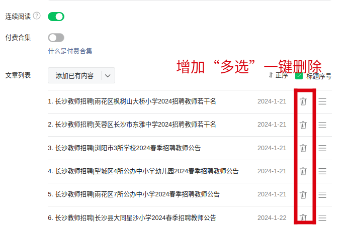 内容管理中的合集文章管理,由于长时间发表积累,文章较多,限制1000篇,达到后(ˇˍˇ) 想~清理部分,建议提供多选删除。