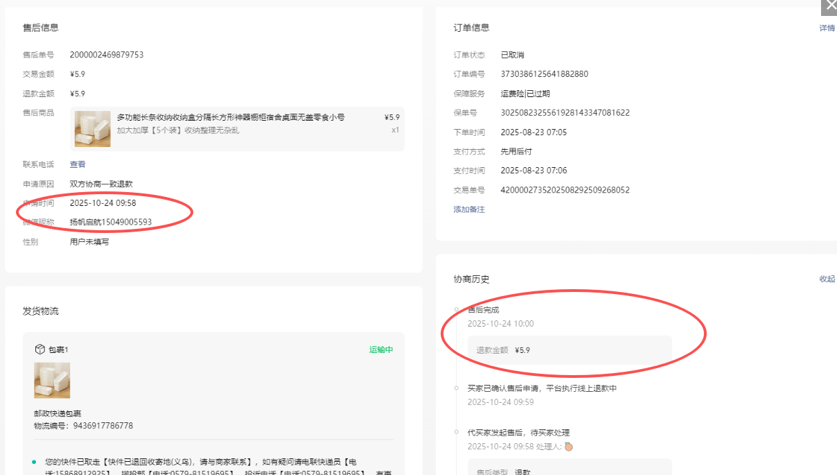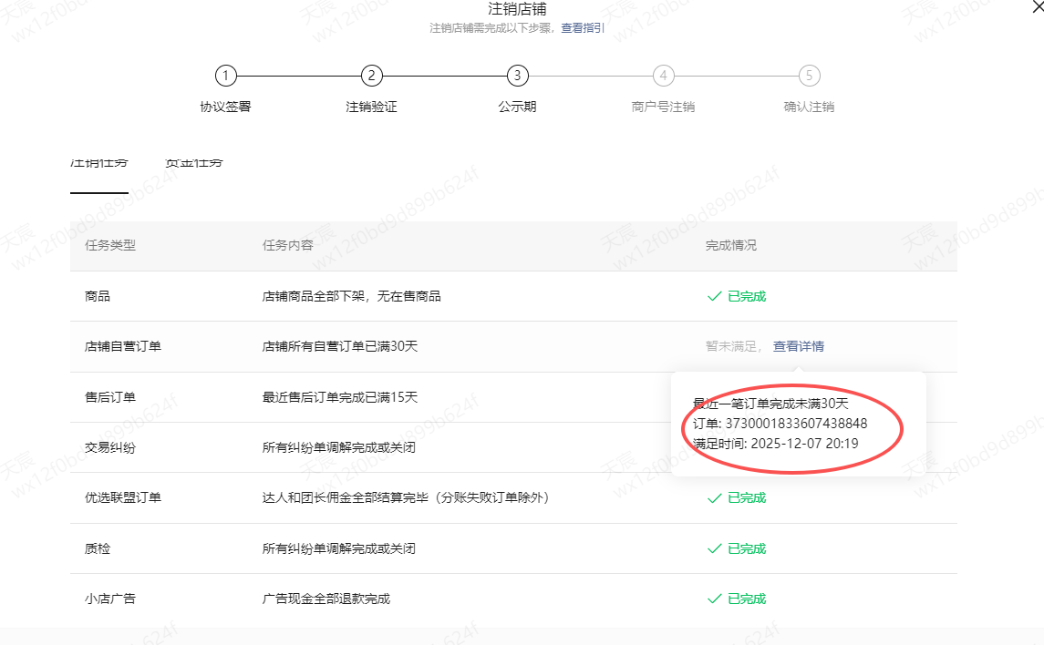 最后一笔订单结算时间为2025/08/27 19:34下单 最后一笔售后订单2025-10-24 09:58 公示期也过了 还是显示最后一笔自营订单时间到2025/12/07