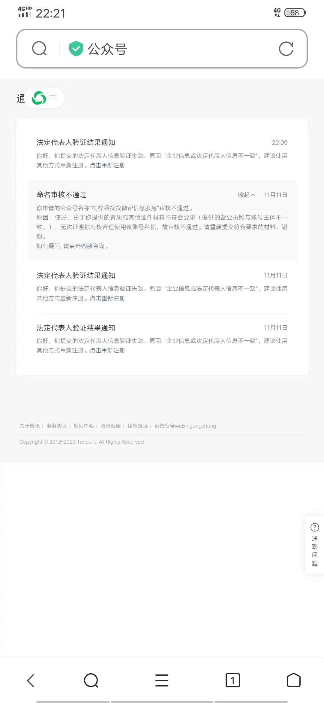 本人微信公众号注册两次都未能成功注册 提示工商信息与法定代表人信息不一致