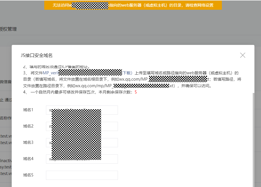微信公众号平台上绑定JS安全接口域名时,总是提示“绑定的域名无法访问,请检查网络设置”,但是我已通过微信官方文档上(https://developers.weixin.qq.com/doc/offiaccount/Basic_Information/Get_the_WeChat_server_IP_address.html)的接口获取到了微信回调的出口IP,并且在我的开发者服务器上也加了访问的IP白名单,但是依旧绑定不了。截图如下: