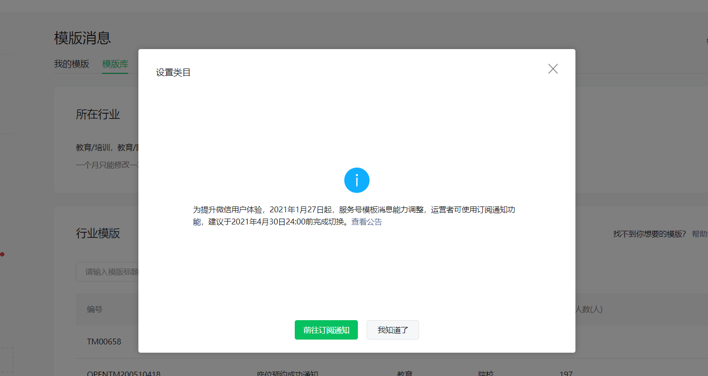 服务号订阅通知灰度测试期自2021年1月27日0:00至4月30日24:00,期间服务号模板消息可正常使用;灰度测试期结束后服务号订阅通知的策略将另行公布,届时以官方信息为准。