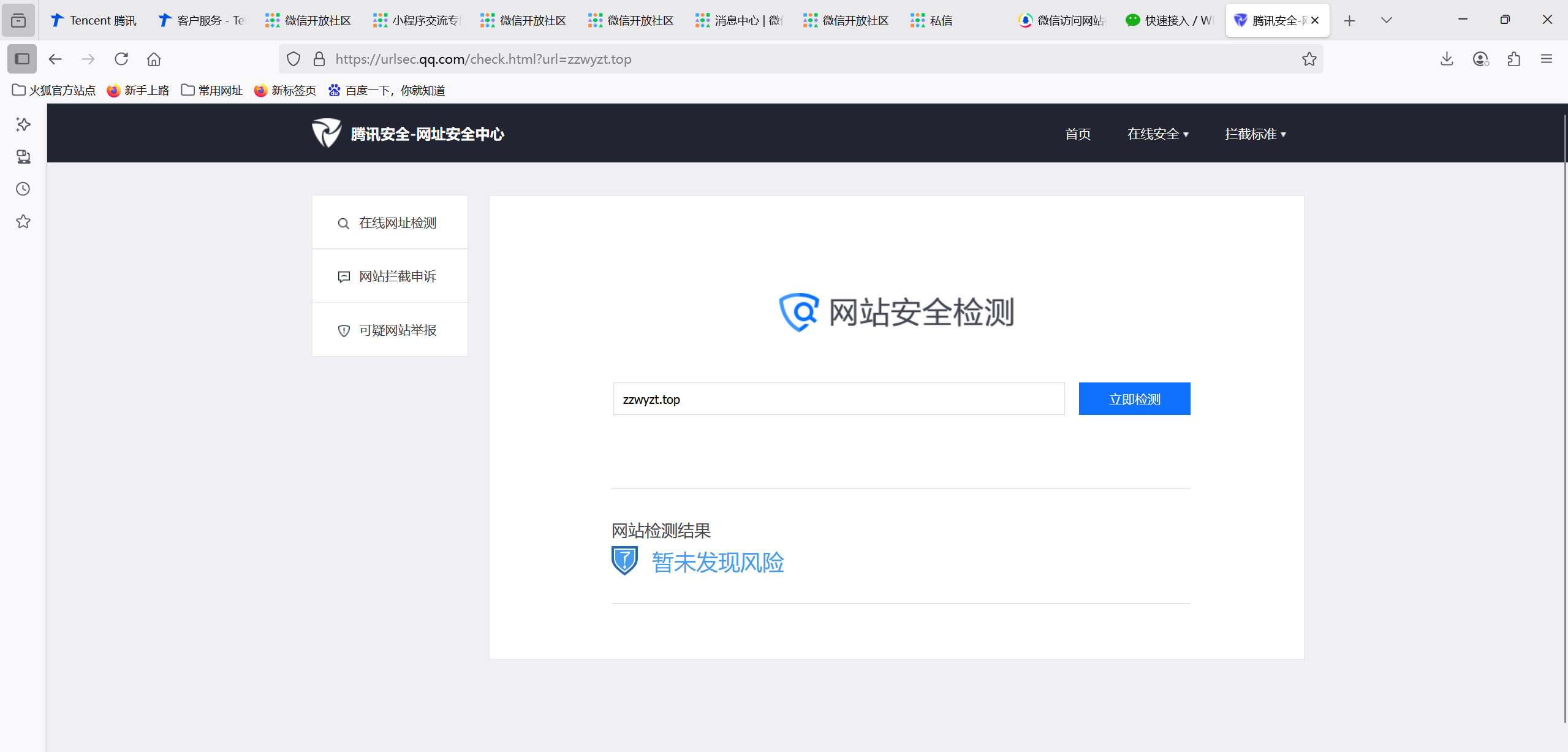 域名备案是正常的,浏览器访问正常,我是网站开发者,微信访问网站出现“无法确认该网页的安全性,请谨慎访问”,经检查网页里没有不安全的内容,腾讯安全-网址安全中心检测也没有发现风险,请核实后帮忙解除拦截,谢谢。