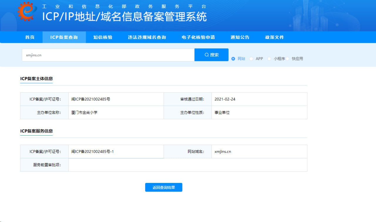 现有厦门市金尚小学官方网站相关访问问题需向贵方反馈:该网站域名为 xmjins.cn,已完成正规 ICP 备案,备案 / 许可证号为 闽 ICP 备 2021002485 号 - 1。当前用户通过微信访问该网站时,会触发提示 “如需浏览,请长按网址复制后使用浏览器访问”,影响学校官方信息的正常传递与家长、师生的便捷访问。