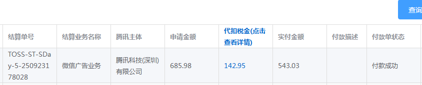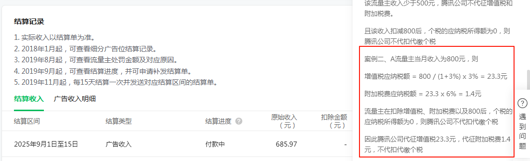 流量主也可登录微信公众平台,进入流量主页面的【财务管理】-【结算信息】点击下方的“查看历史付款及缴税说明”入口,查看对应单据的实代扣税金详情进行核对。(纳税期间为相同月份的单据,代表需合并计税。)
